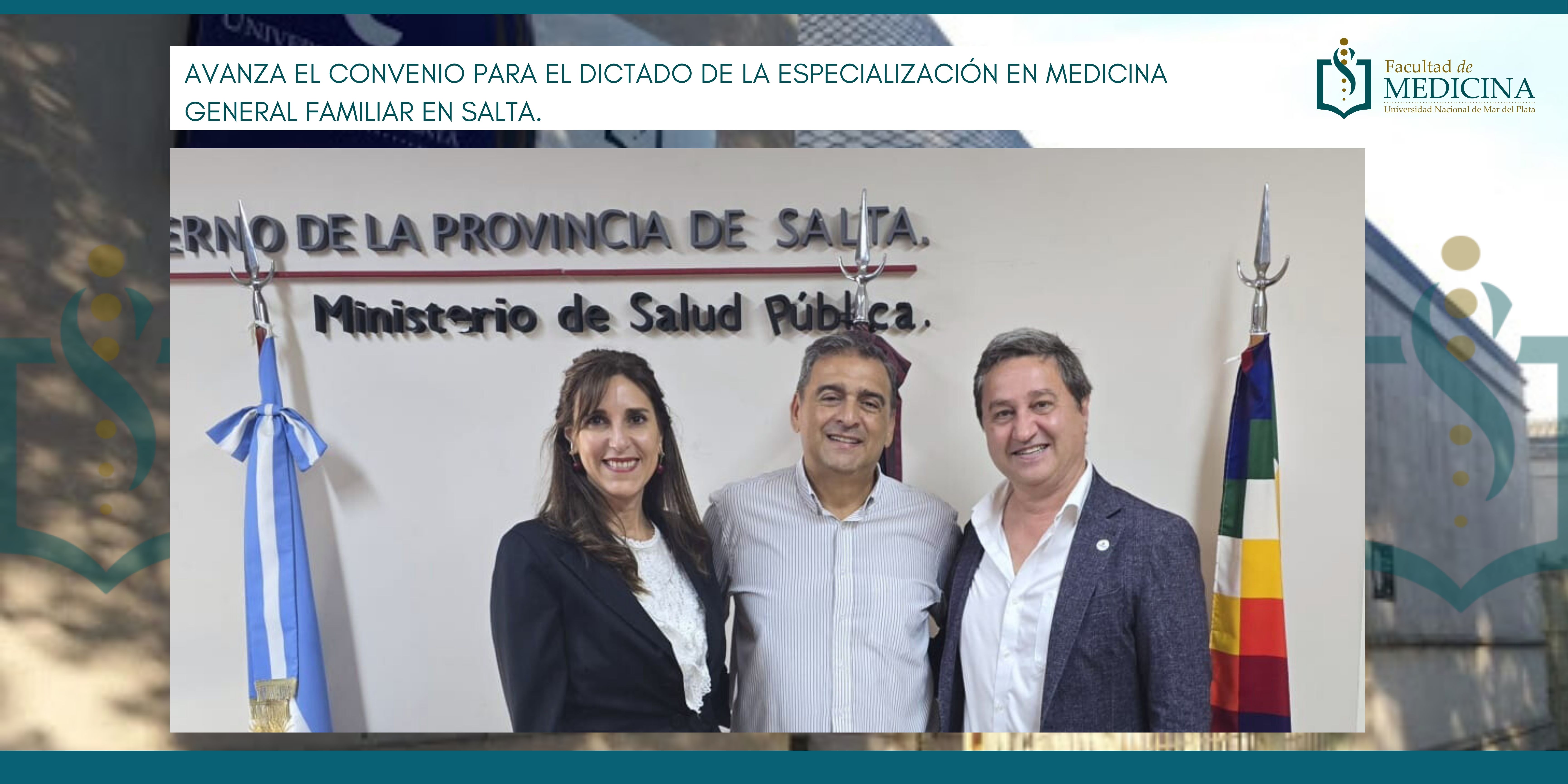 Avanza el convenio para el dictado de la Especialización en Medicina General Familiar en SaltaEl decano de la Facultad de Medicina de la Universidad Nacional de Mar del Plata, Adrián Alasino, se reunió con el ministro de Salud de la provincia, Federico Mangione, junto a la vicedecana de la Facultad de Ciencias de la Salud de la Universidad Nacional de Salta, Alejandra Falú, para avanzar en el convenio que permitirá dictar en Salta la…in Novedades Prensa -