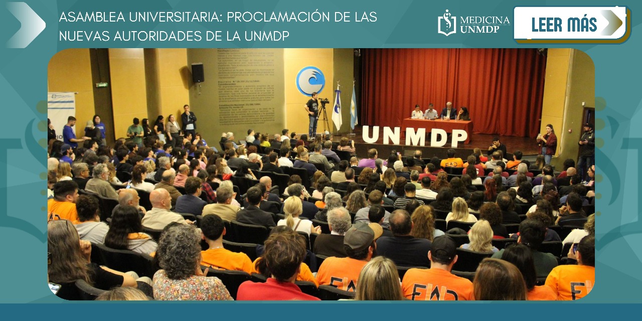 Asamblea Universitaria: proclamación de las nuevas autoridades de la UNMDPEn el Aula Maggi del Complejo Universitario participamos de la Asamblea Universitaria convocada para la proclamación de la fórmula electa integrada por Mónica Biasone como Rectora y Marina Sánchez Herrero como Vicerrectora de la Universidad Nacional de Mar del Plata. Nuestra Facultad de Medicina estuvo representada por sus asambleístas docentes, graduados y estudiantiles, quienes formaron parte de este importante acto…in Novedades Prensa -